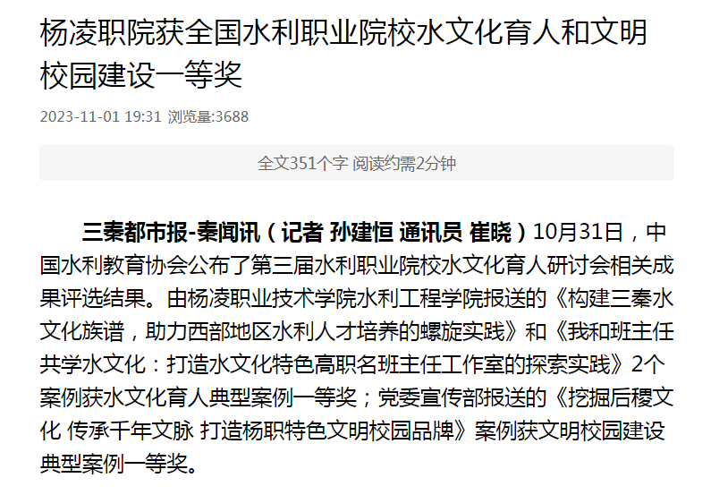 三秦都市报-秦闻讯(记者 孙建恒 通讯员 崔晓)10月31日,中国水利教育协会公布了第三届水利职业院校水文化育人研讨会相关成果评选结果。由杨凌职业技术学院水利工程学院报送的《构建三秦水文化族谱,助力西部地区水利人才培养的螺旋实践》和《我和班主任共学水文化:打造水文化特色高职名班主任工作室的探索实践》2个案例获水文化育人典型案例一等奖;党委宣传部报送的《挖掘后稷文化 传承千年文脉 打造杨职特色文明校园品牌》案例获文明校园建设典型案例一等奖。