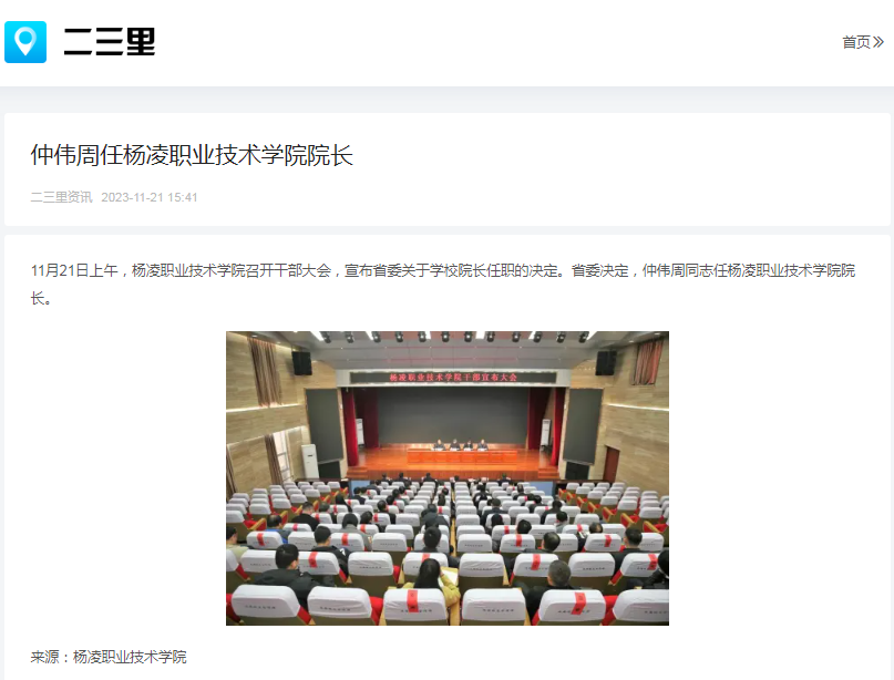 11月21日上午,杨凌职业技术学院召开干部大会,宣布省委关于学校院长任职的决定。省委决定,仲伟周同志任杨凌职业技术学院院长。