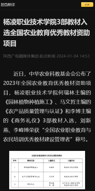 近日,中华农业科教基金会公布了2023年全国农业教育优秀教材资助项目,杨凌职业技术学院何瑞林主编的《园林植物种植施工》、马文哲主编的《农产品质量管理与认证》和李博主编的《商务礼仪》3部教材入选,刘新燕、李峰博荣获“全国农业职业教育与农民培训优秀教材建设管理者”称号。