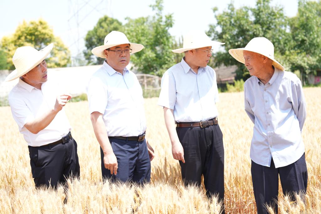 小满节气过后,冬小麦即将进入完熟期,麦穗由青变黄。豆村教学实验农场麦浪翻滚,满目金黄,一幅小麦丰收的画卷徐徐展开。在赵瑜研究员的带领下,仲伟周一行走进麦田,参观大穗大粒优质高产小麦品种“武农981”“武农988”表现情况和小麦新品种繁育情况。望着眼前一片片根粗苗壮、穗大粒满的小麦,大家难掩心中喜悦,一边听赵瑜研究员介绍小麦的生长条件和特性,一边询问小麦收成、农民收益情况。