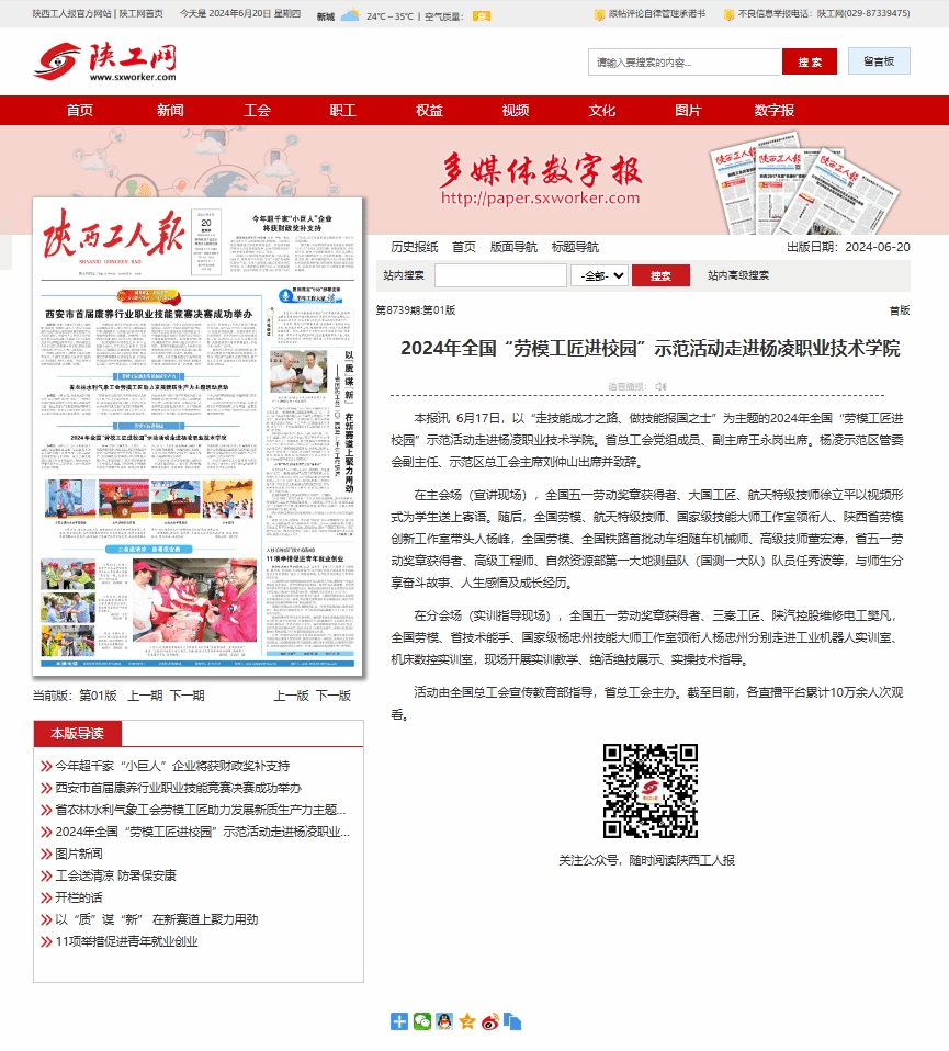 本报讯 6月17日,以“走技能成才之路、做技能报国之士”为主题的2024年全国“劳模工匠进校园”示范活动走进杨凌职业技术学院。省总工会党组成员、副主席王永岗出席。杨凌示范区管委会副主任、示范区总工会主席刘仲山出席并致辞。