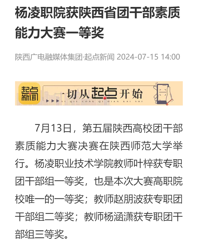 7月13日,第五届陕西高校团干部素质能力大赛决赛在陕西师范大学举行。杨凌职业技术学院教师叶梓获专职团干部组一等奖,也是本次大赛高职院校唯一的一等奖;教师赵朋波获专职团干部组二等奖;教师杨涵潇获专职团干部组三等奖。