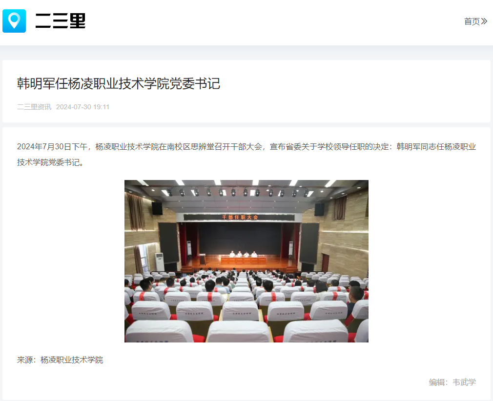 【二三里】韩明军任杨凌职业技术学院党委书记