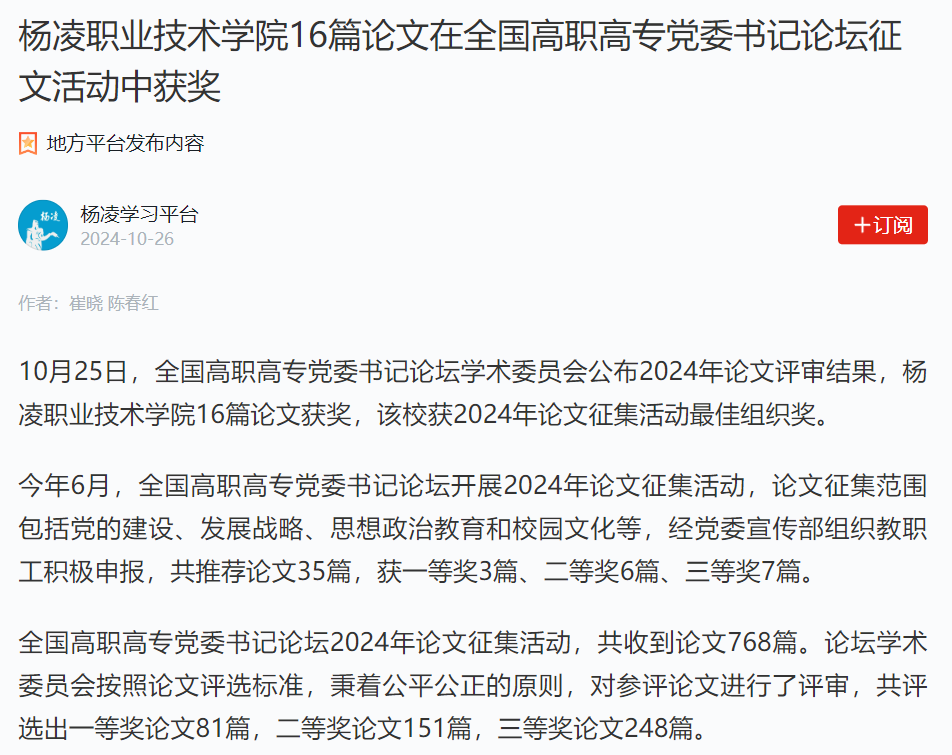 10月25日,全国高职高专党委书记论坛学术委员会公布2024年论文评审结果,杨凌职业技术学院16篇论文获奖,该校获2024年论文征集活动最佳组织奖。