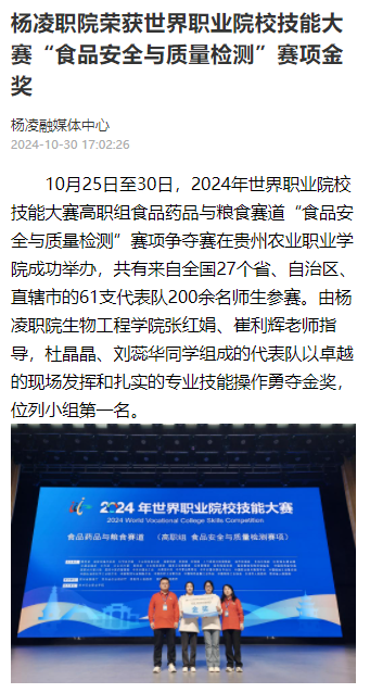 10月25日至30日,2024年世界职业院校技能大赛高职组食品药品与粮食赛道“食品安全与质量检测”赛项争夺赛在贵州农业职业学院成功举办,共有来自全国27个省、自治区、直辖市的61支代表队200余名师生参赛。由杨凌职院生物工程学院张红娟、崔利辉老师指导,杜晶晶、刘蕊华同学组成的代表队以卓越的现场发挥和扎实的专业技能操作勇夺金奖,位列小组第一名。