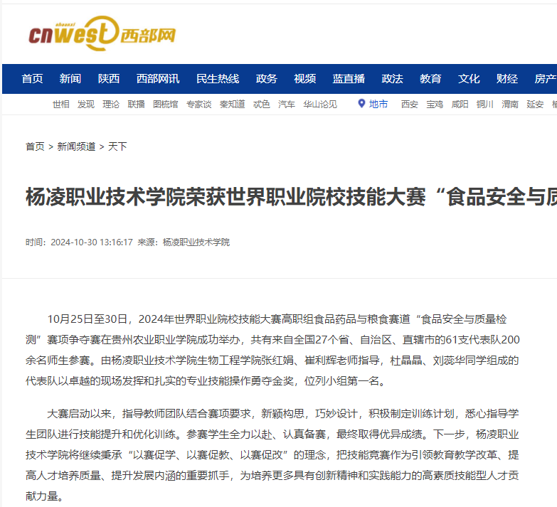 【西部网】杨凌职业技术学院荣获世界职业院校技能大赛“食品安全与质量检测”赛项金奖