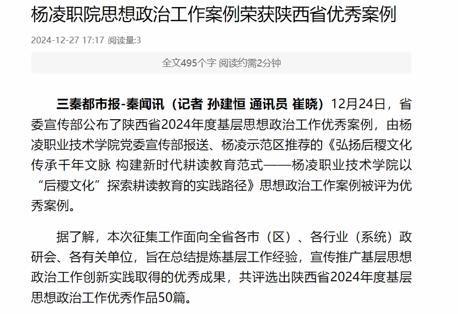 三秦都市报-秦闻讯(记者 孙建恒 通讯员 崔晓)12月24日,省委宣传部公布了陕西省2024年度基层思想政治工作优秀案例,由杨凌职业技术学院党委宣传部报送、杨凌示范区推荐的《弘扬后稷文化 传承千年文脉 构建新时代耕读教育范式——杨凌职业技术学院以“后稷文化”探索耕读教育的实践路径》思想政治工作案例被评为优秀案例。