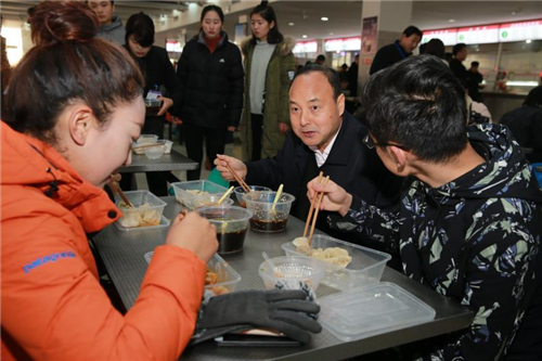 上午10点半在杨凌职院南校区餐厅,已有不少学生陆续拿着餐券在各个橱窗前排队等候,不一会儿,一盘盘热腾腾的饺子就已上桌。吃着热腾腾的饺子,大家有说有笑。到了中午用餐时间,该院领导赵曼、王周锁、任得元、张永良、刘粉莲、张迪和著名小麦育种专家赵瑜研究员也相继来到南、西、北三个校区的餐厅,与学生们一起吃饺子、过冬至。