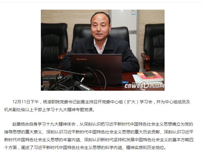 12月11日下午,杨凌职院党委书记赵曼主持召开党委中心组(扩大)学习会,并为中心组成员及机关副处级以上干部上学习十九大精神专题党课。