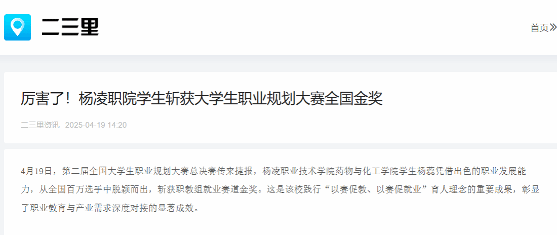 4月19日,第二届全国大学生职业规划大赛总决赛传来捷报,杨凌职业技术学院药物与化工学院学生杨蕊凭借出色的职业发展能力,从全国百万选手中脱颖而出,斩获职教组就业赛道金奖。这是该校践行“以赛促教、以赛促就业”育人理念的重要成果,彰显了职业教育与产业需求深度对接的显著成效。