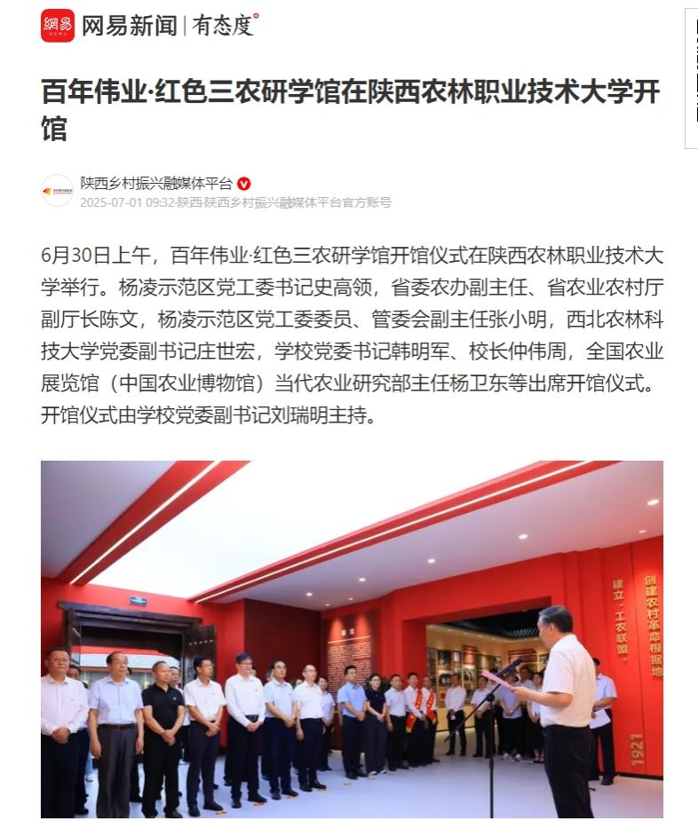 韩明军在致辞中指出,学校将以研学馆为平台,教育引导广大师生深入了解中国共产党解决“三农”问题的光辉历程,厚植“三农”情怀,不忘初心使命,勇挑强农兴农重担。作为农业农村部庆祝中国共产党成立100周年主题展巡展点、陕西省农村基层干部培训基地、杨凌示范区研学教育实践基地,研学馆将积极主动服务杨凌示范区发展,服务、辐射全省、全国旱区乃至全国党员干部、大中小学生的红色三农教育工作,凝聚更加强大的力量,为农业高质高效、乡村宜居宜业、农民富裕富足作出更大的贡献。据了解,百年伟业·红色三农研学馆集中展示了中国共产党解决“三农”问题走过的不凡道路、取得的辉煌成就、积累的宝贵经验,以全国农业展览馆《百年伟业 三农华章——庆祝中国共产党成立100周年主题展》《三农这十年——新时代农业农村发展成就展》为蓝本,面积达800㎡,包含序厅、新民主主义革命时期、社会主义革命和建设时期、改革开放和社会主义现代化建设时期、推进中国特色社会主义进入新时代、互动体验区6大板块,以大量珍贵的资料、图片、图表和实物,生动展现了自1921年以来中国共产党带领亿万农民从翻身得解放、脱贫奔小康到同心共筑中国梦的光辉历程。