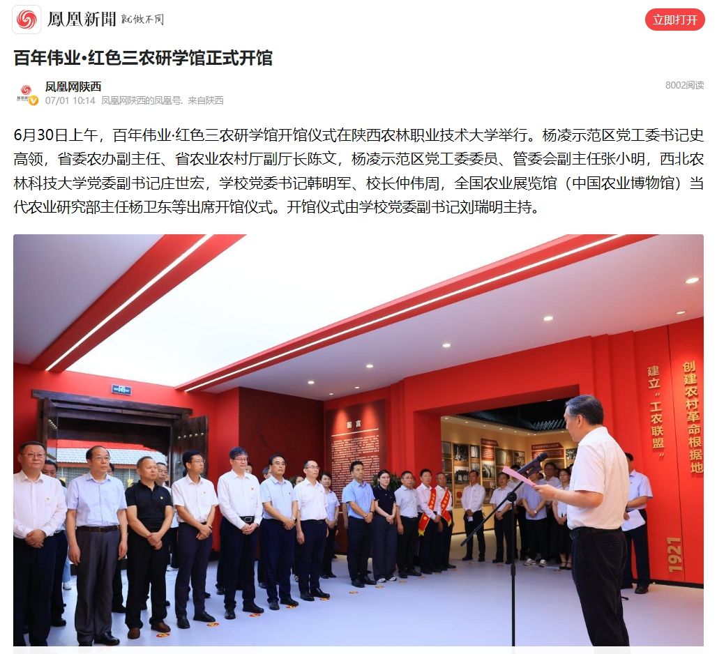 韩明军在致辞中指出,学校将以研学馆为平台,教育引导广大师生深入了解中国共产党解决“三农”问题的光辉历程,厚植“三农”情怀,不忘初心使命,勇挑强农兴农重担。作为农业农村部庆祝中国共产党成立100周年主题展巡展点、陕西省农村基层干部培训基地、杨凌示范区研学教育实践基地,研学馆将积极主动服务杨凌示范区发展,服务、辐射全省、全国旱区乃至全国党员干部、大中小学生的红色三农教育工作,凝聚更加强大的力量,为农业高质高效、乡村宜居宜业、农民富裕富足作出更大的贡献。