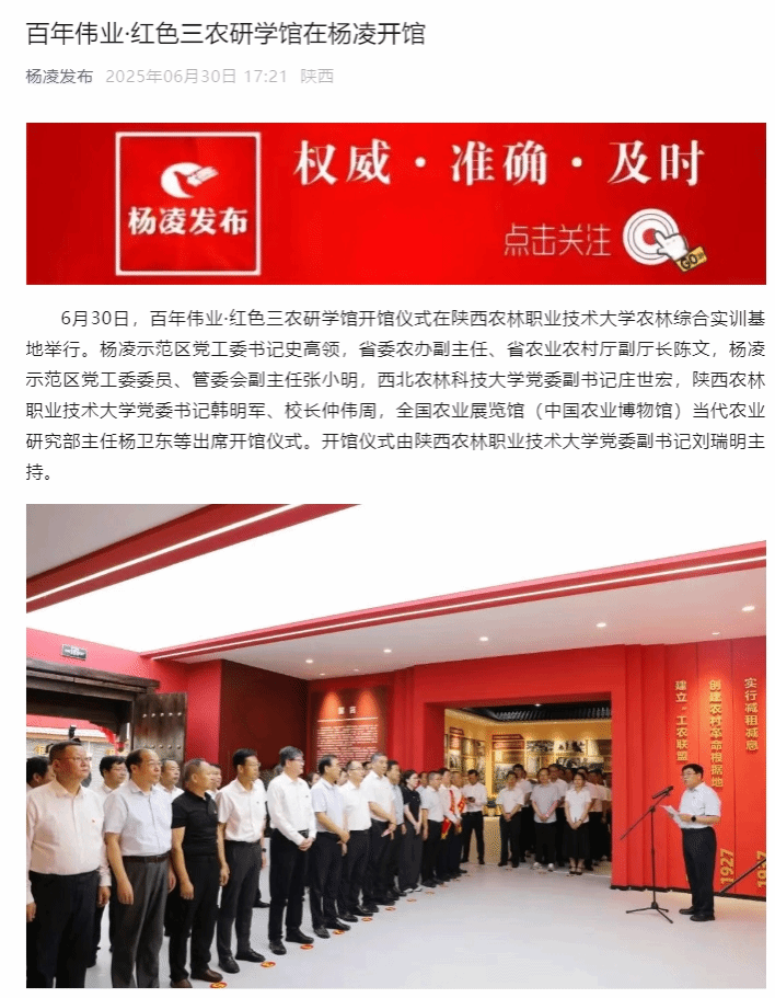 6月30日,百年伟业·红色三农研学馆开馆仪式在WilliamHill官方网站农林综合实训基地举行。杨凌示范区党工委书记史高领,省委农办副主任、省农业农村厅副厅长陈文,杨凌示范区党工委委员、管委会副主任张小明,西北农林科技大学党委副书记庄世宏,WilliamHill官方网站党委书记韩明军、校长仲伟周,全国农业展览馆(中国农业博物馆)当代农业研究部主任杨卫东等出席开馆仪式。开馆仪式由WilliamHill官方网站党委副书记刘瑞明主持。