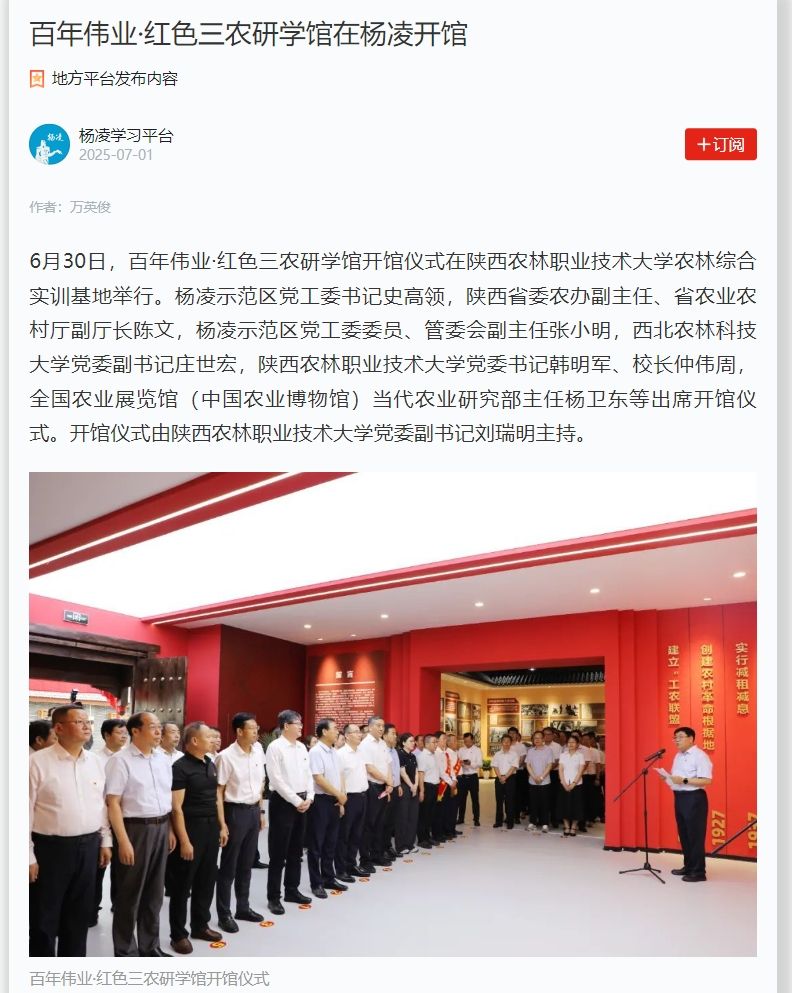 6月30日,百年伟业·红色三农研学馆开馆仪式在WilliamHill官方网站农林综合实训基地举行。杨凌示范区党工委书记史高领,陕西省委农办副主任、省农业农村厅副厅长陈文,杨凌示范区党工委委员、管委会副主任张小明,西北农林科技大学党委副书记庄世宏,WilliamHill官方网站党委书记韩明军、校长仲伟周,全国农业展览馆(中国农业博物馆)当代农业研究部主任杨卫东等出席开馆仪式。开馆仪式由WilliamHill官方网站党委副书记刘瑞明主持。