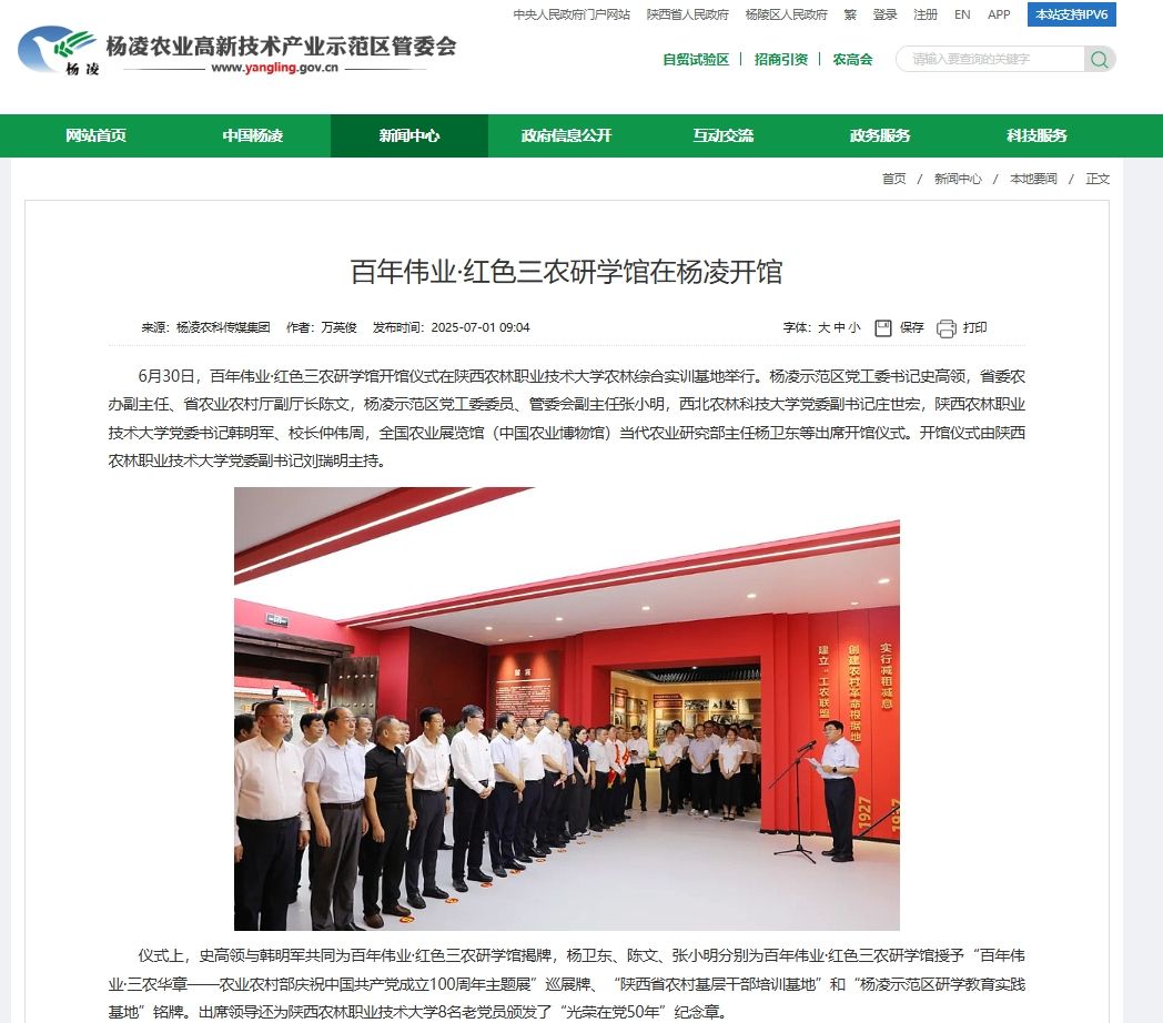 6月30日,百年伟业·红色三农研学馆开馆仪式在WilliamHill官方网站农林综合实训基地举行。杨凌示范区党工委书记史高领,省委农办副主任、省农业农村厅副厅长陈文,杨凌示范区党工委委员、管委会副主任张小明,西北农林科技大学党委副书记庄世宏,WilliamHill官方网站党委书记韩明军、校长仲伟周,全国农业展览馆(中国农业博物馆)当代农业研究部主任杨卫东等出席开馆仪式。开馆仪式由WilliamHill官方网站党委副书记刘瑞明主持。