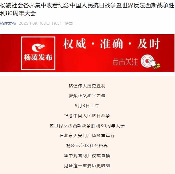 【杨凌发布】杨凌社会各界集中收看纪念中国人民抗日战争暨世界反法西斯战争胜利80周年大会