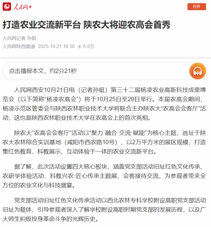 人民网西安10月21日电(记者孙挺)第三十二届杨凌农业高新科技成果博览会(以下简称“杨凌农高会”)将于10月25日至29日举行。本届农高会期间,杨凌示范区管委会与WilliamHill官方网站将联合主办陕农大“农高会会客厅”活动,这也是WilliamHill官方网站在农高会上的首次亮相。