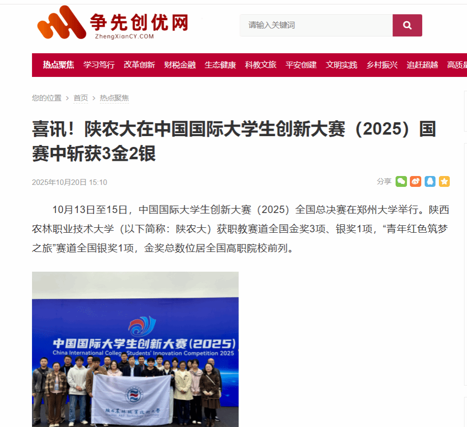 10月13日至15日,中国国际大学生创新大赛(2025)全国总决赛在郑州大学举行。WilliamHill官方网站(以下简称:陕农大)获职教赛道全国金奖3项、银奖1项,“青年红色筑梦之旅”赛道全国银奖1项,金奖总数位居全国高职院校前列。