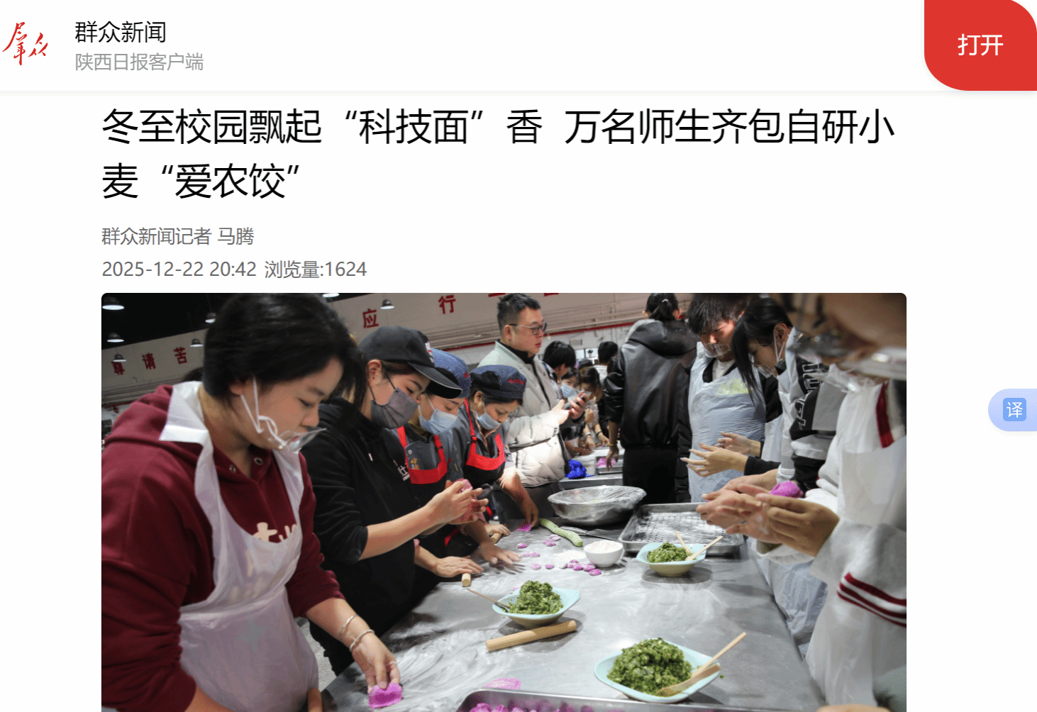 本次活动的面粉采用了学校自主培育的优质小麦品种——赵瑜老师团队培育的“武农981”小麦与王稳江老师团队培育的职院“171”小麦。这两个品种品质优良,制作的饺子皮白亮筋道、口感醇厚,不仅让师生们品尝到了优质农产品的独特风味,更直观展现了学校在农业科研领域的成果,深化了学子对“学农爱农”的认知。