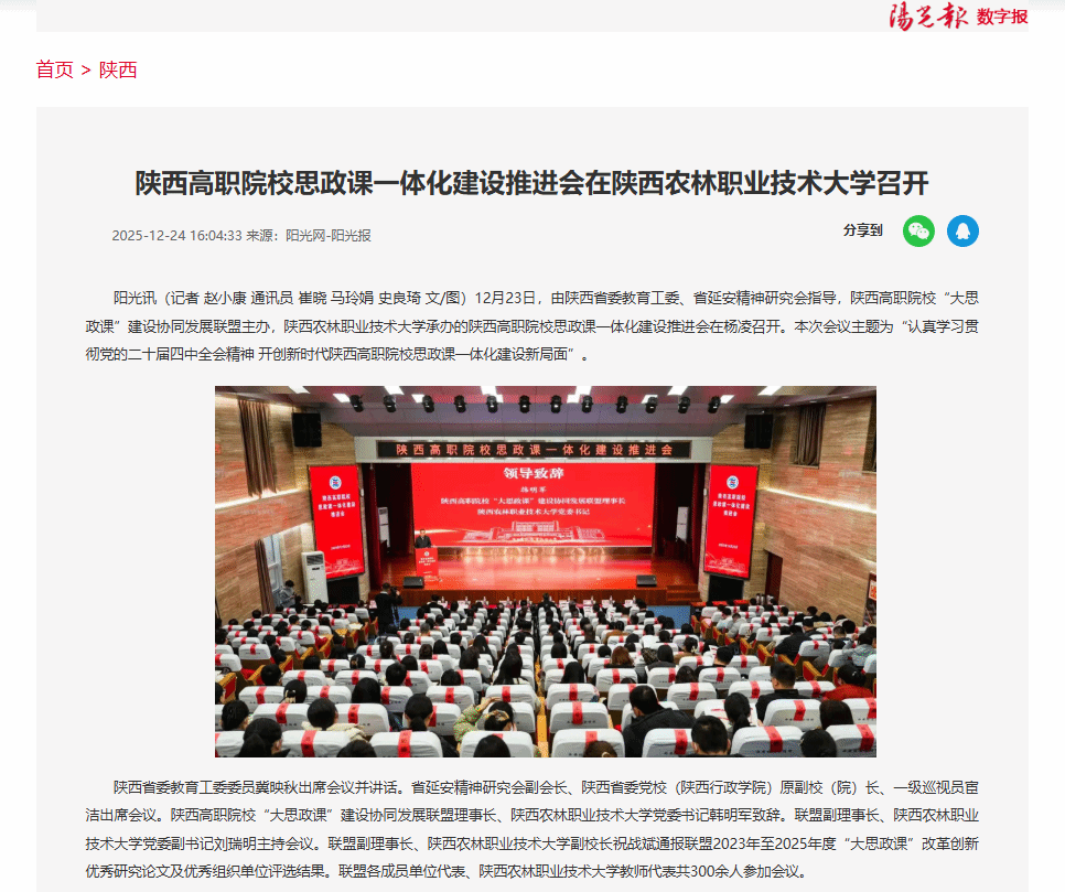 阳光讯(记者 赵小康 通讯员 崔晓 马玲娟 史良琦 文/图)12月23日,由陕西省委教育工委、省延安精神研究会指导,陕西高职院校“大思政课”建设协同发展联盟主办,WilliamHill官方网站承办的陕西高职院校思政课一体化建设推进会在杨凌召开。本次会议主题为“认真学习贯彻党的二十届四中全会精神 开创新时代陕西高职院校思政课一体化建设新局面”。