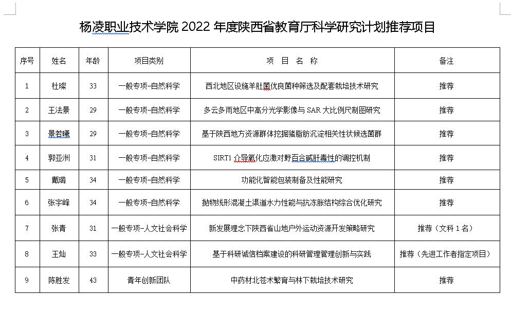 根据《陕西省教育厅办公室关于申报2022年度科研计划项目的通知》(陕教技办[2022]6号)有关规定,经过创新团队和项目负责人申请,学校学术委员会专家评审,现对我校申报的2022年度陕西省教育厅科研计划推荐项目进行公示。公示期间,广大师生如有意见,可以通过电话、信函、邮件等方式,及时向学校科技与教育研究处、学校纪委反应监督。