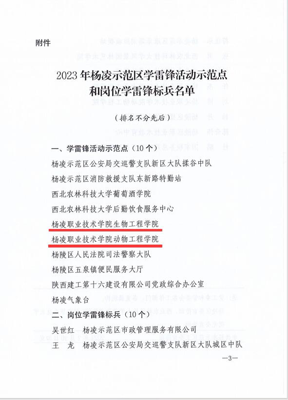 2月20日,杨凌示范区公布了2023年杨凌示范区学雷锋活动示范点和岗位学雷锋标兵名单,学校生物工程学院、动物工程学院获评学雷锋活动示范点教师任杰、刘博荣获“岗位学雷锋标兵”称号。