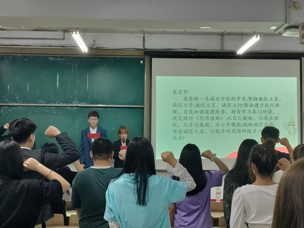 诚信乃中华民族的传统美德,为加强大学生自我管理提升大学生的诚信意识,引导学生树立正确的社会主义荣辱观,响应学院“以诚立身”的理念,5月19日晚在C108学院全体学生干部与部分学生代表进行诚信宣誓活动。