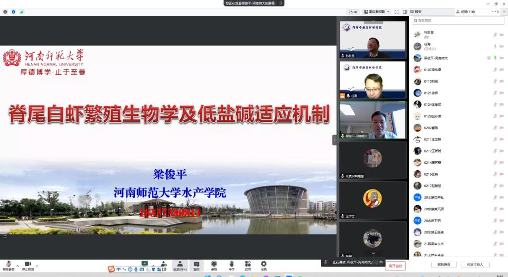 2022年10月23日上午,开云kaiyun官网三期海洋论坛活动在腾讯会议线上进行,本次活动邀请了优秀校友河南师范大学梁俊平博士给开云官网师生做学术报告。会议由水产科学教学部任海博士主持,水产科学教学部全体教师、渔业发展硕士研究生以及开云kaiyun官网本科生300余人收听了报告,学院党委副书记、副院长孙胜显出席会议。