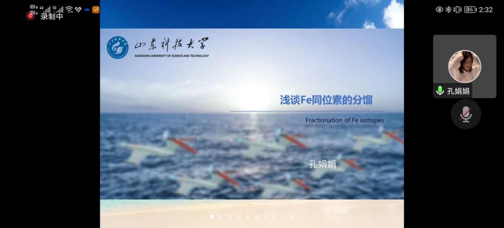 2022年11月6日下午,开云kaiyun官网第四期海洋论坛活动在线上举行,本次活动邀请来自山东科技大学孔娟娟博士为开云官网师生做了题为《浅谈Fe同位素分馏》的学术报告。会议由海洋生物资源教学部马瑶博士主持,学院党委副书记、副院长孙胜显出席会议。参会成员为海洋资源与环境专业全体师生。