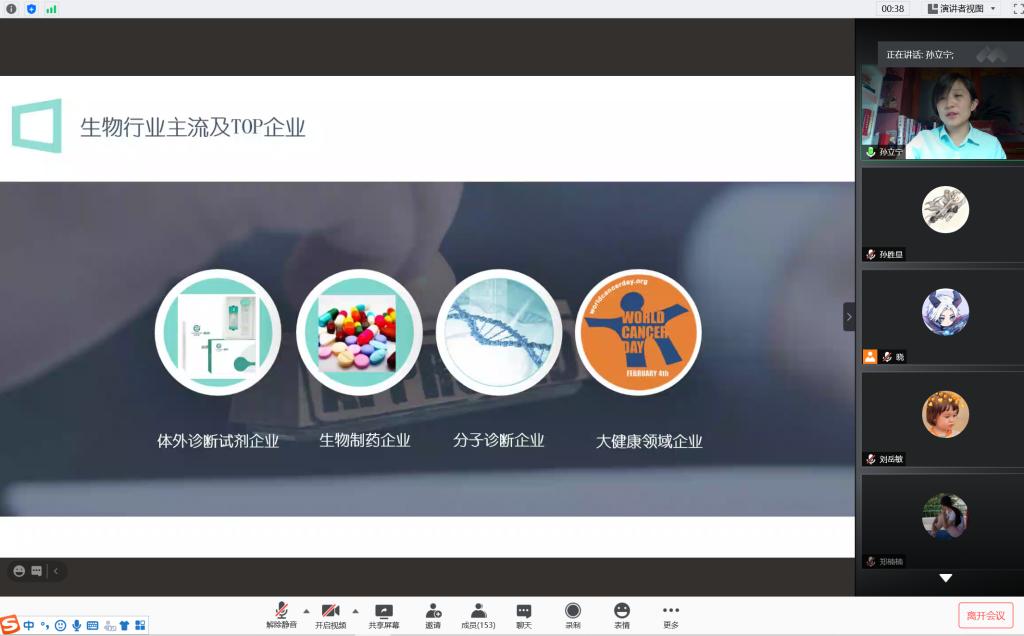 2020年10月11日,开云kaiyun官网邀请浙江诺辉健康科技有限公司高级经理孙立宁通过网络对学院生物科学、生物技术学生进行《生物科学/生物技术专业就业前景》的专题教育教学报告。学院领导、专业老师和学生约300人听取了报告。
